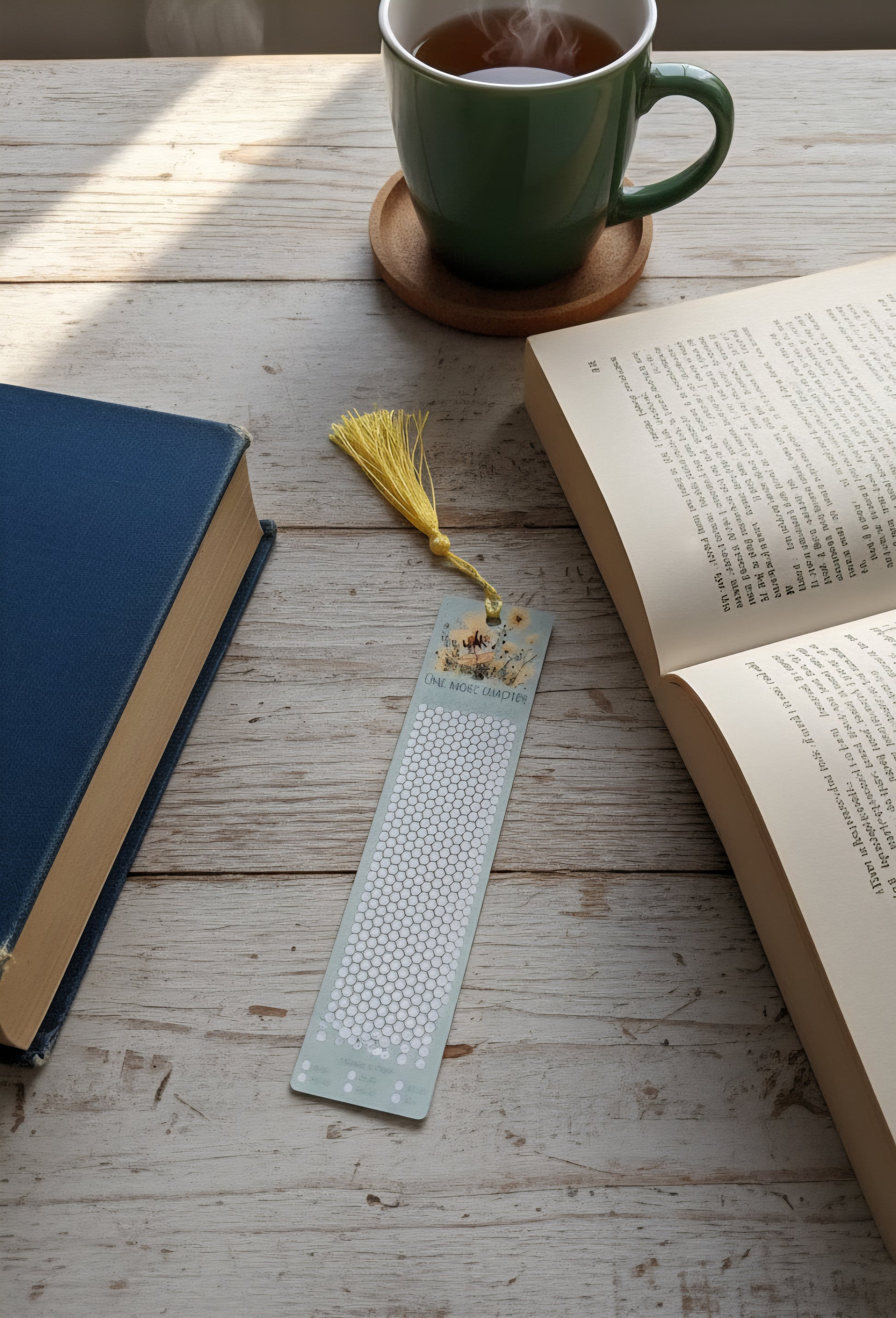 This bookmark, titled "One More Chapter," features a charming bee design and a paper construction for easy use. With a double-sided design, you can keep track of your pages read for the year. Enhance your reading experience with this functional and stylish bookmark.