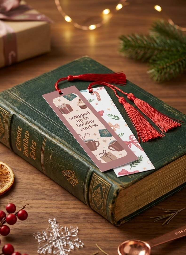 The Story Wrapper is a double-sided paper bookmark designed for the Christmas season. Its cozy aesthetic includes a red tassel, providing both functionality and a festive touch. The bookmark effectively marks your place in books, enhancing reading efficiency without damaging pages.